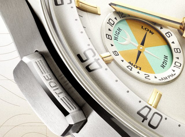 注目すべきは、イントレピッド・ティールと呼ばれるカラーです。これは1967年のアメリカズカップを制したヨット「イントレピッド」に由来し、ジャック・ホイヤーがオリジナルのスキッパー クロノグラフを生み出す着想源となりました。このティールカラーは時分針、30分積算計、そして潮汐表示に採用され、ダークイエローと組み合わされることで、ヴィンテージモデルへのオマージュを表現しています。