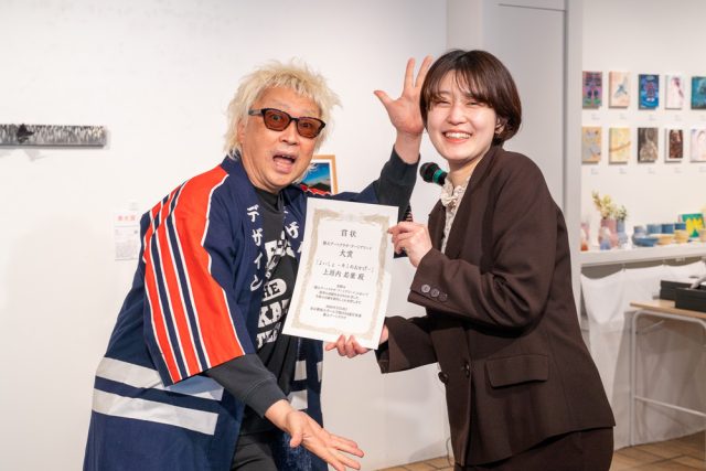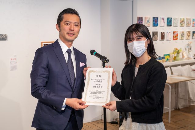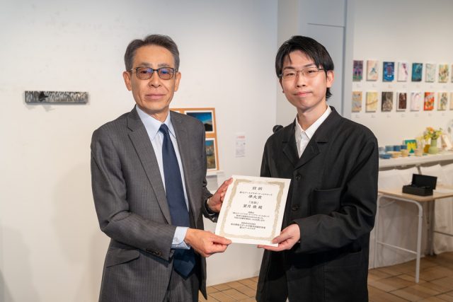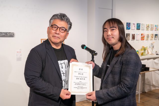 その後受賞式へ。今年度の大賞を受賞した上垣内若葉さんへ、箭内・藝大アートプラザ所長が賞状とトロフィーを授与されました。