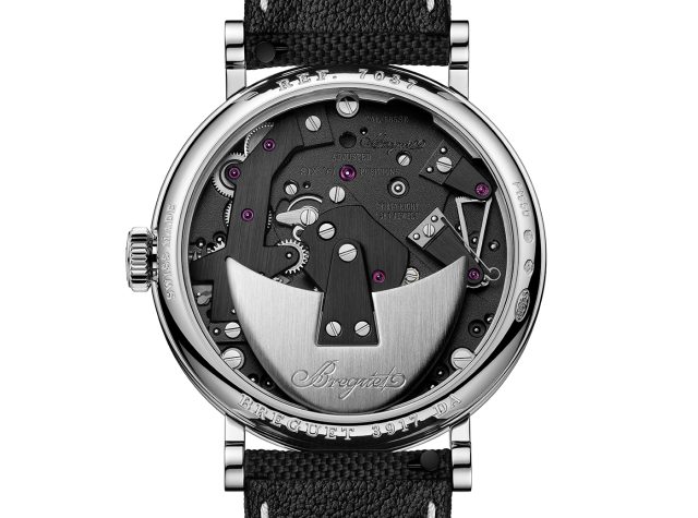時計を裏返せば、半月形のローターが静かに揺れています。現代の自動巻き時計に広く普及する全回転式ローターとは異なり、振り子のように弧を描く「バスキュール式」の巻き上げ機構です。この半月形ローターの設計もまた、アブラアン-ルイ・ブレゲ自身が考案したものを直接参照しています。往復の動きでぜんまいに力を蓄えていく様子は、古典的な巻き上げの様式美を体現しています。