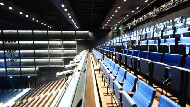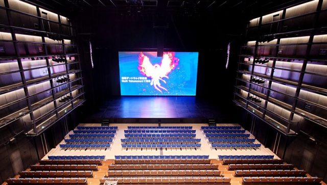 続くBox1000は、地下空間に大きく展開していきます。エスカレーターを下りると、ステージ前面に高精細LEDを備えた最新のパフォーマンス空間が広がります。着席1048席、スタンディングで最大2000人を収容でき、ライブ、演劇、インスタレーションなど多彩な使い方が可能。非常に見やすく、たとえば歌舞伎であれば前方席でしか味わえなかった表情や熱量まで、大型LEDによってどの席からもリアルに体感できそうです。