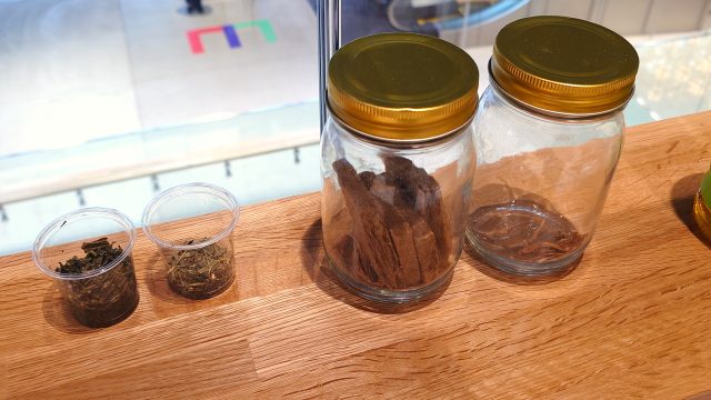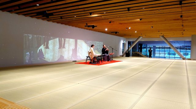 4階の「Tatami」は、約100畳の広さをもつ展示・上演空間です。靴を脱いで上がる場でありながら、和の伝統文化とテクノロジーを組み合わせたさまざまなプログラムを展開できるようになっており、大型プロジェクターも常設。内覧時には和楽器の生演奏が流れ、い草の香りと音の余韻が混ざる、静かに贅沢な空間が立ち上がっていました。しかも畳床には、伊藤園の製造工程で出る茶殻をリサイクルした素材が使われています。休むこと、座ること、香りを感じることまで含めて、ここでは文化体験として再定義されているようでした。