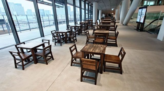 さらに館内には、高輪築堤に関わる松杭を再利用したベンチや、鉄道防災林の木材をアップサイクルしたベンチ、大阪・関西万博の日本政府館で使われた家具など、物語(Narrative)にあふれる家具が点在。歩いているだけで、素材それぞれの来歴に自然に目が向く、徹底した作り込みは好感が持てました。
