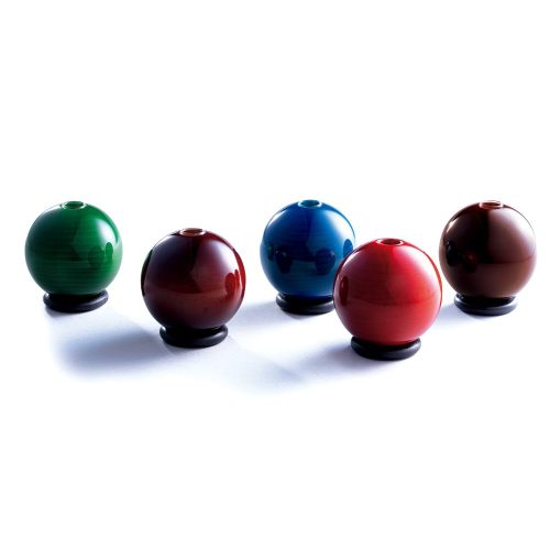 無垢材の球体が美しい花器になるまでには、木地検査、花を挿す部分の穴開け、木地研磨、下塗り、下研ぎ、着色、ポリエステル塗料の吹き付け、バフ研磨など全15工程を踏む。研磨の工程は熟練職人が段階的に塗膜の厚さや硬さを見極めながら丁寧に作業を重ねていくことで、ピアノ塗装と同じクリアな艶が生まれるのだ。