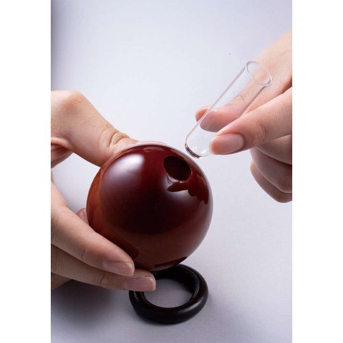 写真=こはく 花を挿す部分には水差し用のガラス管がセットされている。木球は台座リングを下に置くことで安定する。