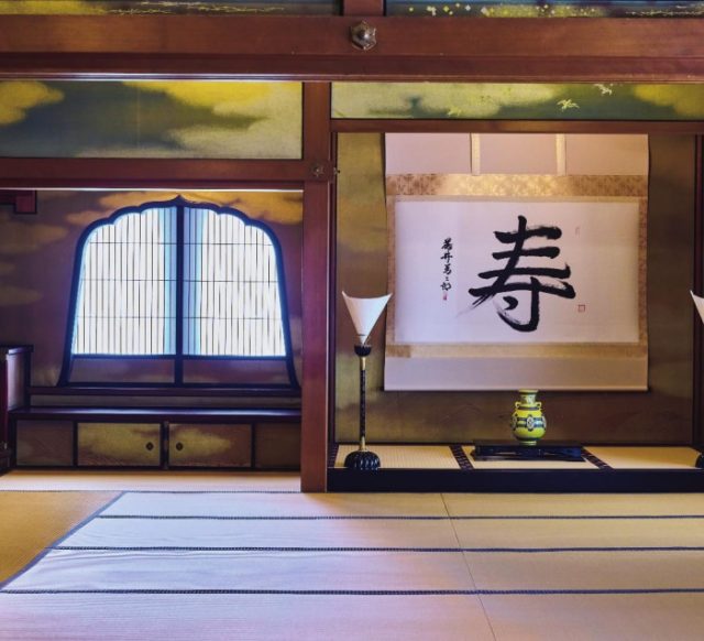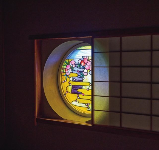中3階の茶室「長楽庵」には和洋を融合するかのような円窓のステンドグラスがはめ込まれている。また3階の書院造りの和室「御成の間」は、北側の窓に頂部が優美な曲線を描いた華頭窓が設えられ、東山を一望できる。