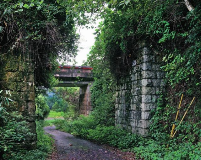 梶ヶ谷隧道から加茂駅方面に2kmほど歩くと観音寺橋台に到着。橋台の向こうにはJR関西本線の橋が見える。ともに同時期に造られたが、片や現役、片や廃線という対比が郷愁を誘う。