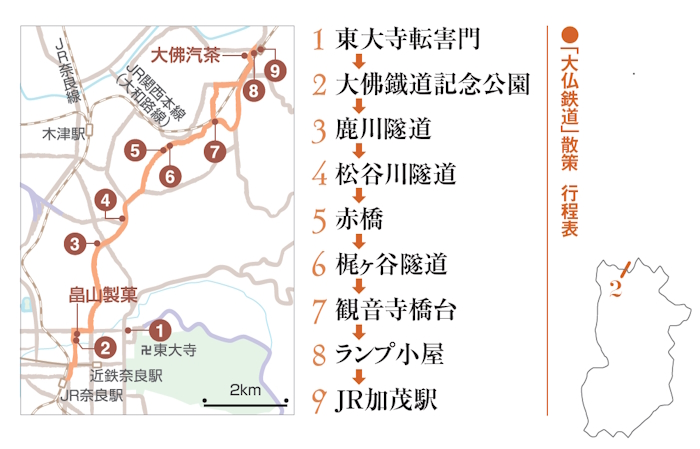 その大仏鉄道が近年注目されている。廃線跡にはトンネルや橋台などの鉄道遺構がいくつも遺り、それらを訪ねながらのハイキングを楽しむ人が増えてきた。歩き通せば、奈良駅から府県境を越え京都府の加茂駅を目指す、総距離13kmほど、徒歩で3~4時間のルートだ(加茂~奈良のルートもある)。