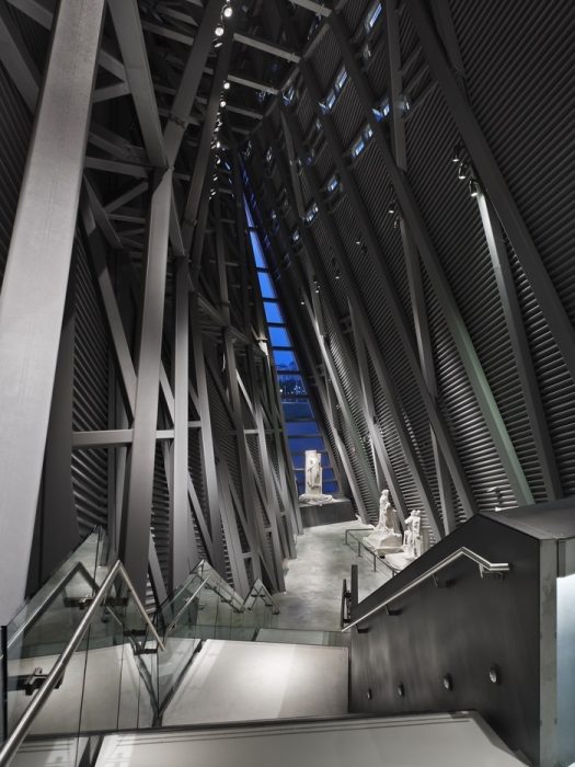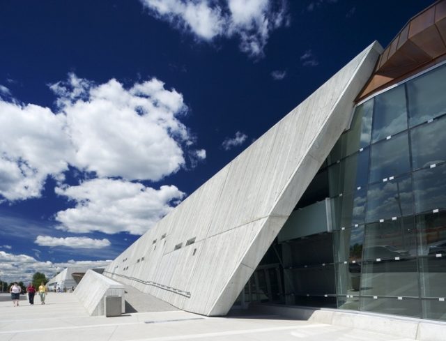 自然との共存を表現した屋根一面を覆う緑の植物。そして幾何学的なデザインの外装と、床や壁に傾斜を多用した内装デザインは、訪問者に芸術的な要素と戦争に対する不安を体感させる試みだ。