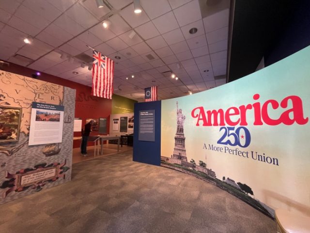 ロビーを通り抜けると、中央にはギフトショップがあり、左側にニクソンに関する常設展示スペース、右側にはさまざまな臨時イベントが行われるスペースがある。現在は米国の建国250周年を記念する特別展示を開催中である(2026年末まで)。