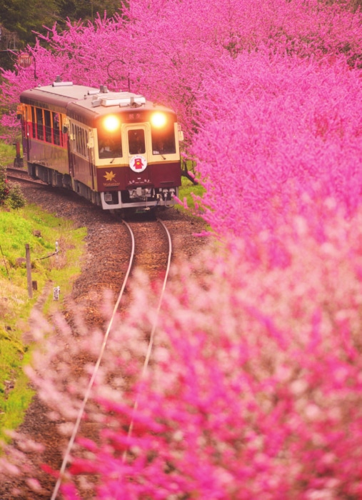 山笑う頃、風薫る頃、鉄路沿いには心躍る風景が広がる。車窓から花景色を望み、花の名所を巡る。群馬県~栃木県 のわたらせ渓谷鐵道では花桃を楽しめる。時期は3月下旬〜4月上旬。