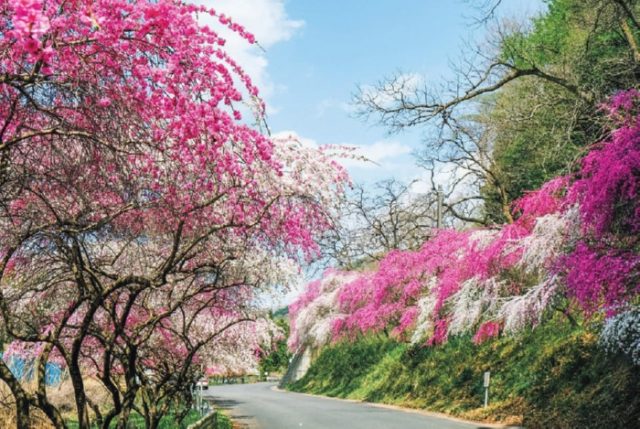 花輪駅で下車して15分ほど歩くと「枝垂れ花桃」が咲き乱れる「小夜戸・大畑花桃街道」に着く。地元の人が育てた2000本以上の花桃の並木が約2kmも続く、山里の桃源郷である。